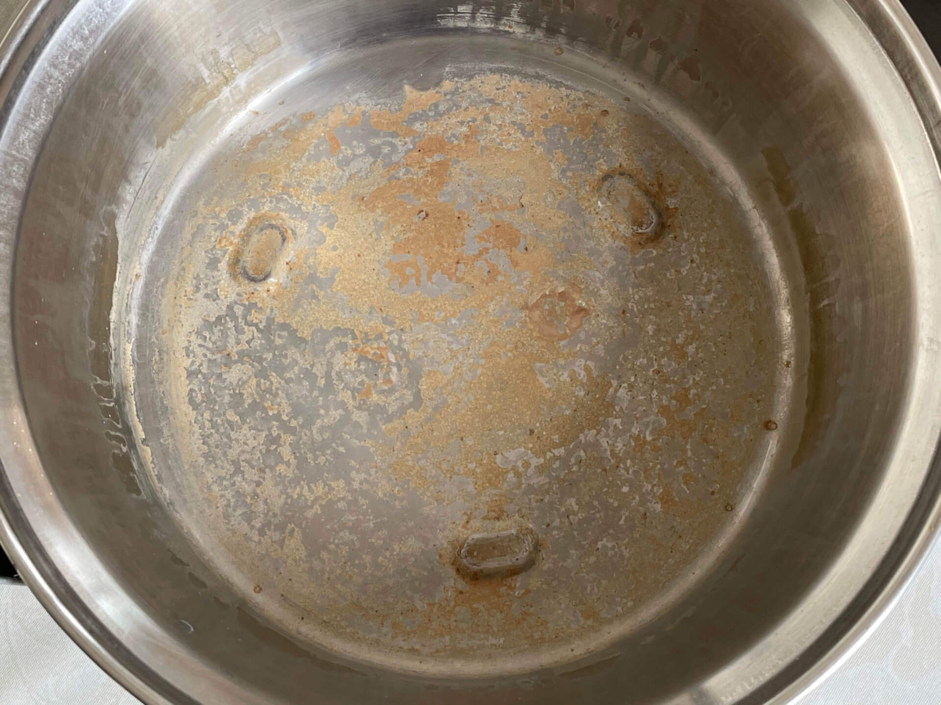 觀察鍋壁上的顏色可以發現,下方有浸泡到檸檬酸的部分明顯乾淨很多,而上方沒有浸泡到的部分還是有頑垢,所以在浸泡時如果想要連鍋壁上的這些頑垢都清除,就要把水加滿一點。